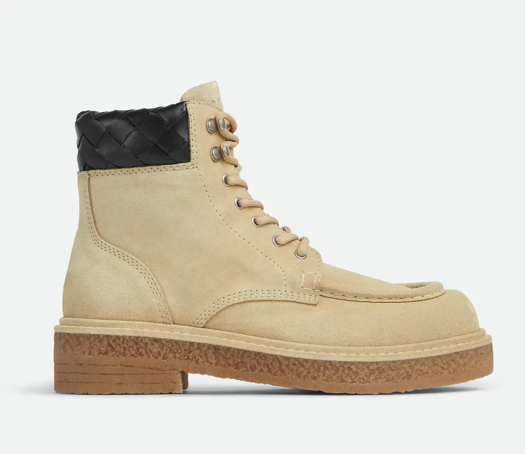 Las escogidas por Rocky son los Haddock Lace-Up Boots de Bottega Veneta, en un delicado color arena. Están confeccionadas en ante robusto, con una suela de goma efecto crepé que equilibra resistencia y estilo. El detalle diferenciador es el cuello de cuero intrecciato en negro —el trenzado icónico de la maison italiana—, aunque en el estilismo del rapero quedaba oculto bajo sus pantalones.